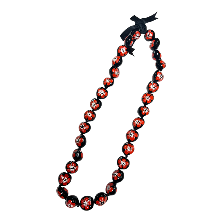 Painted Red Hibiscus on Black Kukui Lei
